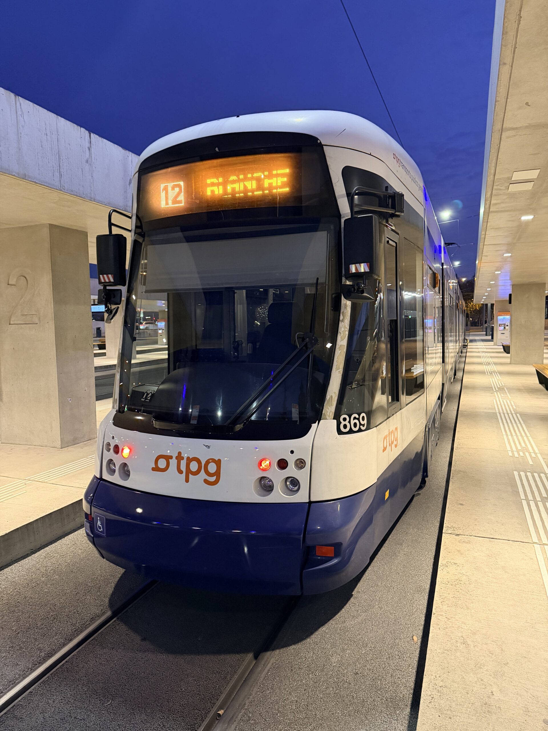 Ci-dessous, photographie de la motrice Bombardier 869 à l’arrêt de Lancy-Bachet.