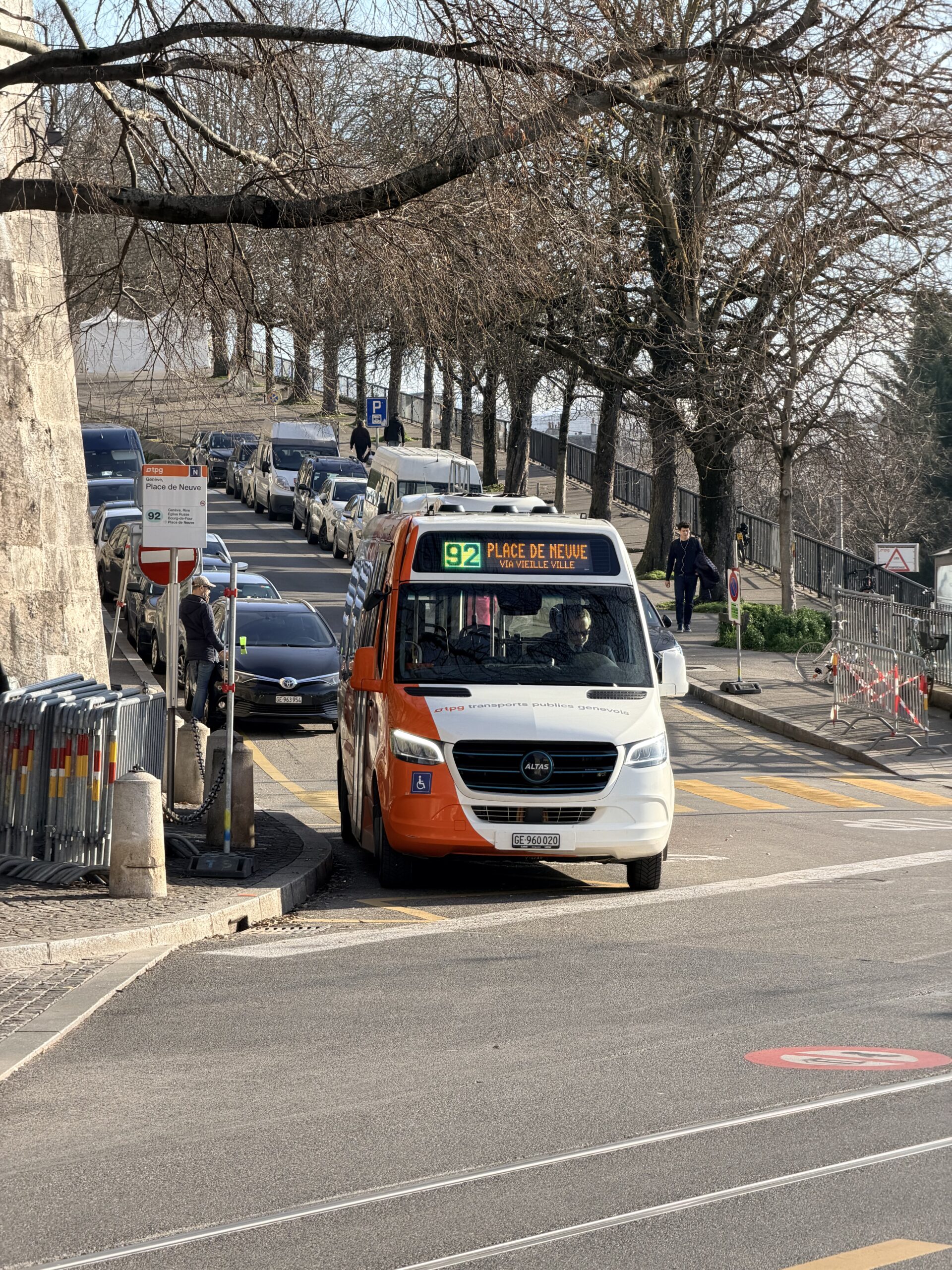 Ci-dessous, photographie d’un minibus électrique circulant sur la ligne 92, en attente du départ de la Place de Neuve.