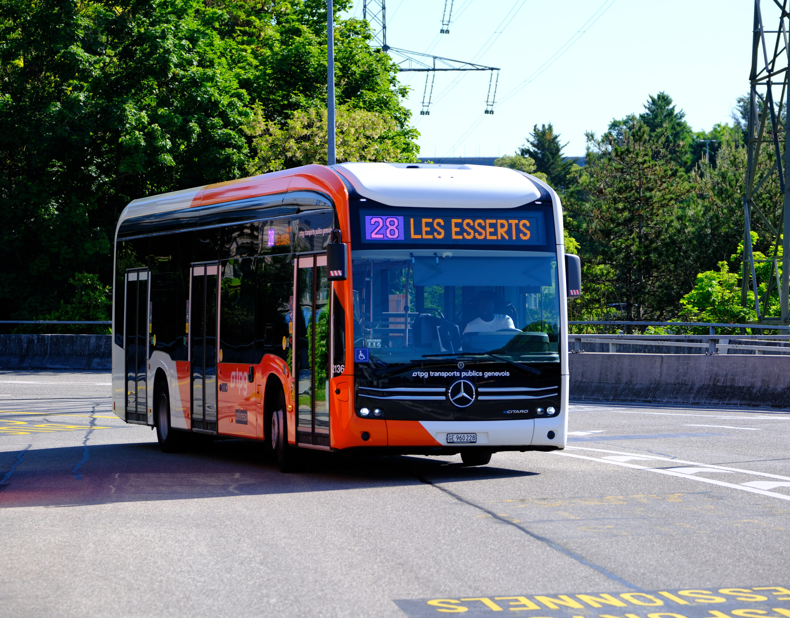 Ci-dessous, une photographie d’un autobus électrique e-citaro sur la ligne 28 du côté de l’aéroport.