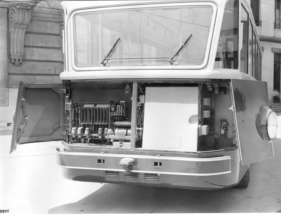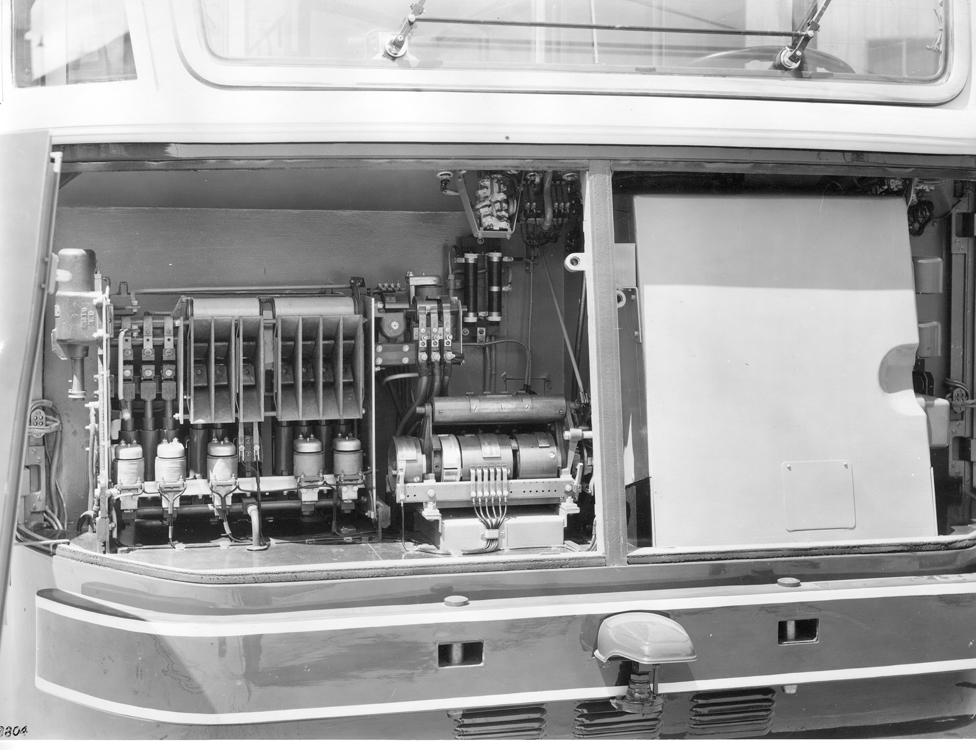 Le trolleybus peut aussi se déplacer sur de petites distances au moyen des trois groupes de batteries branchées en série, ce qui donne une tension de 72 volts. On effectue le changement de couplage au moteur au moyen d’un commutateur ligne-batterie, à commande a main.