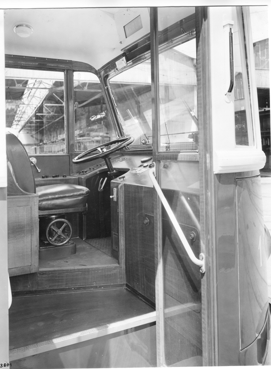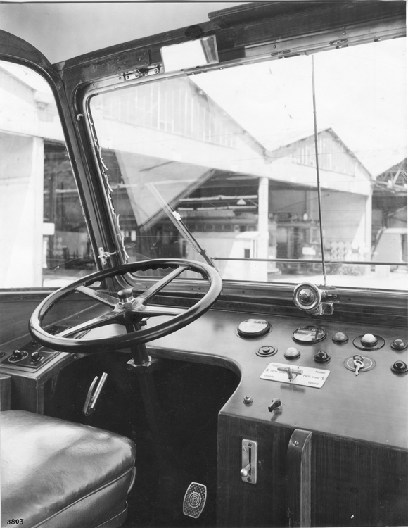 A noter qu’il fallait de bons biceps pour conduire ces trolleys sans direction assistée ! Ci-dessous, le poste de conduite du trolleybus – Collection bustramgeneve