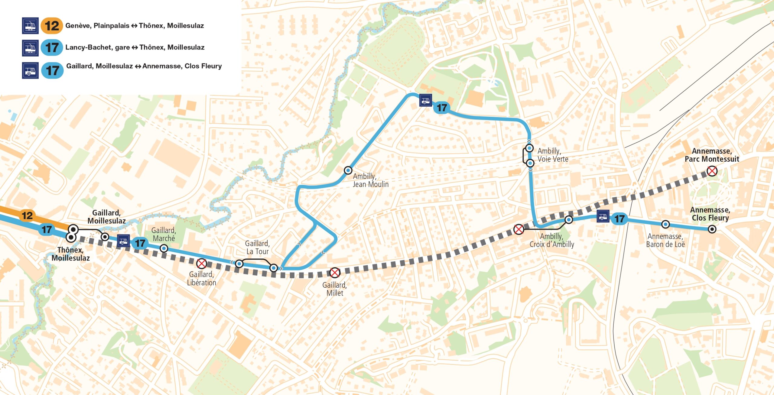 Des bus de remplacement circulent entre Gaillard, Moillesulaz et Annemasse, Clos Fleury selon le plan ci-dessous.