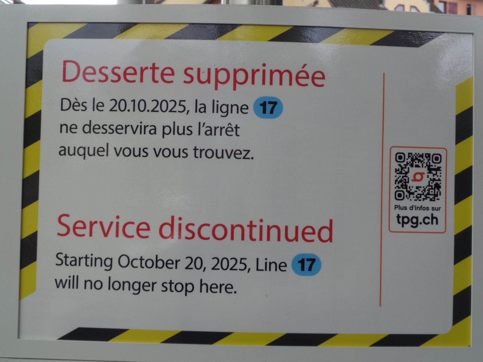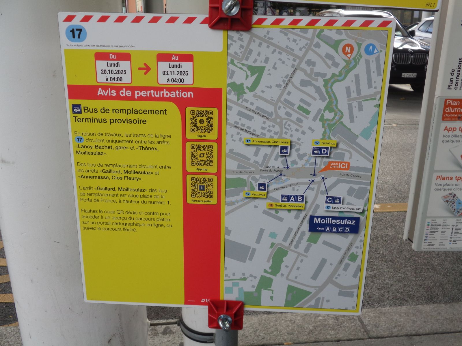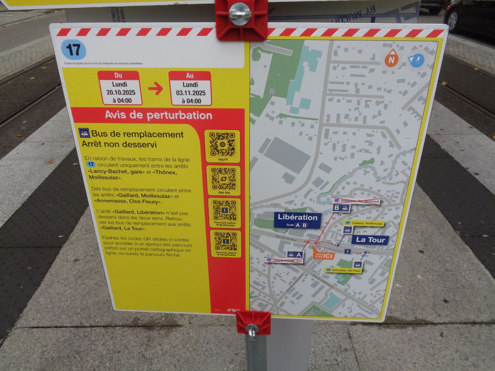 La ligne de tram 17 sera interrompue entre Moillesulaz et Parc Montessuit, du lundi 20 octobre au dimanche 3 novembre afin de permettre notamment la jonction des rails en vue de l’extension du tracé du tram dans Annemasse.